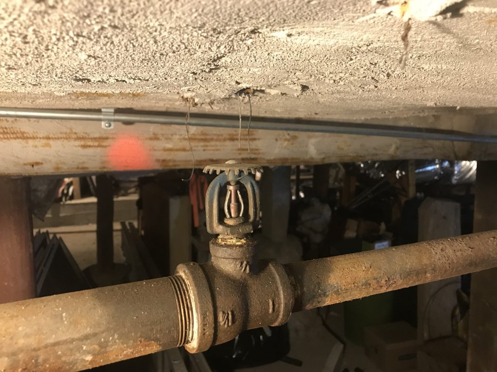 The fire suppression system was installed 50 years ago. It is a “dry” system where air keeps valves closed to avoid water freezing during wintertime. An electric-powered compressor counters micro-leaks to maintain pipe air pressure. During heat detection events, water is supposed to be released to put out fires — but this aging system has been experiencing more and more leaks and the possibility of expensive repairs. The risk of inadvertent flooding during power outages is rising over time. Pipe repairs and replacement have been ongoing, but some more significant system upgrades are recommended in addition to more pipe repairs.