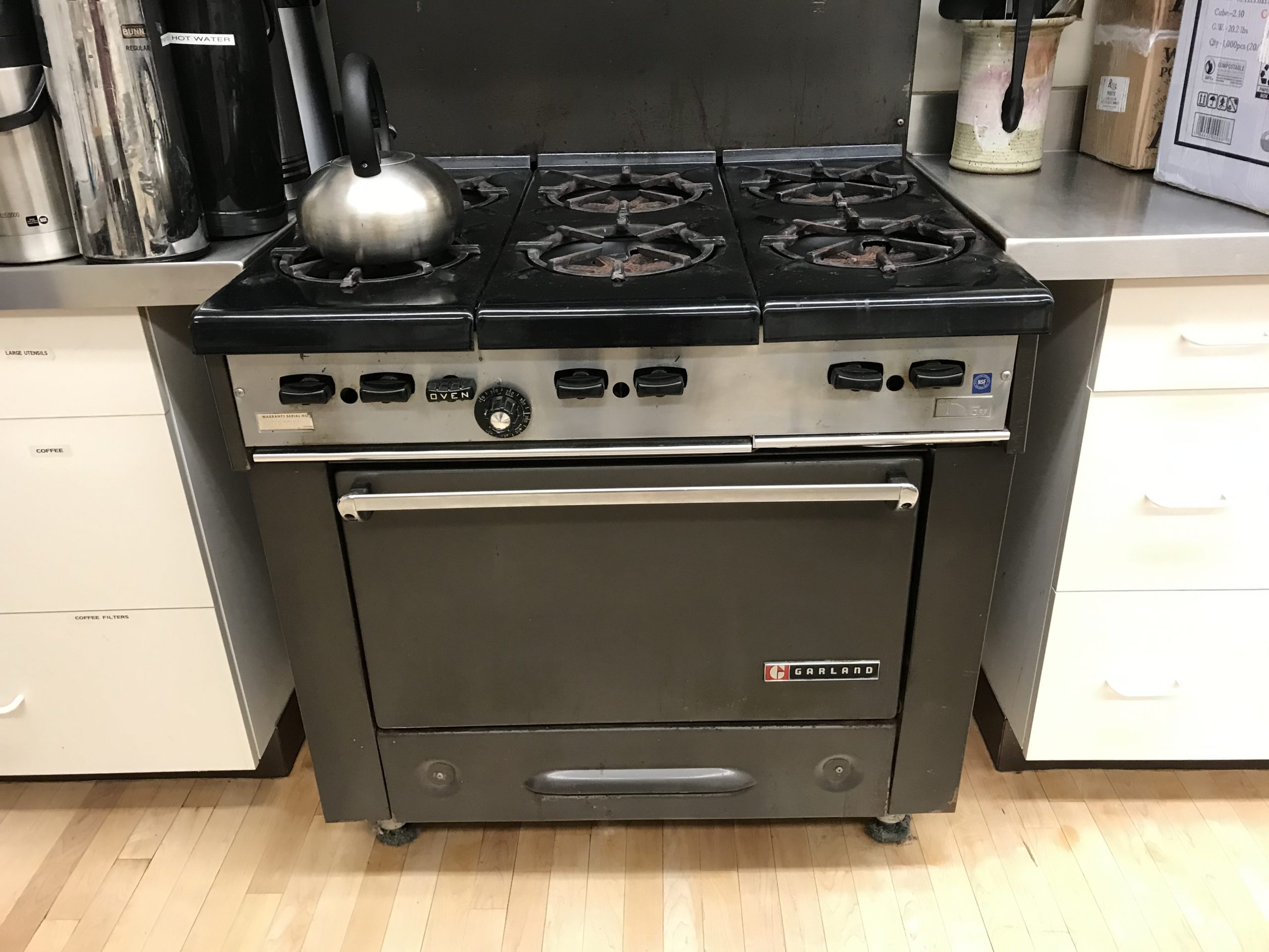 The gas-fired range in the Common Room kitchen is more than 20 years old and has some leaks. The stove could be replaced in kind (with natural gas), replaced with an electric stove/oven, replaced with an induction cooktop, or removed altogether. Replacement may also require additional kitchen cosmetic upgrades. All solutions will factor in user safety. Electric solutions may require an electric capacity upgrade.
